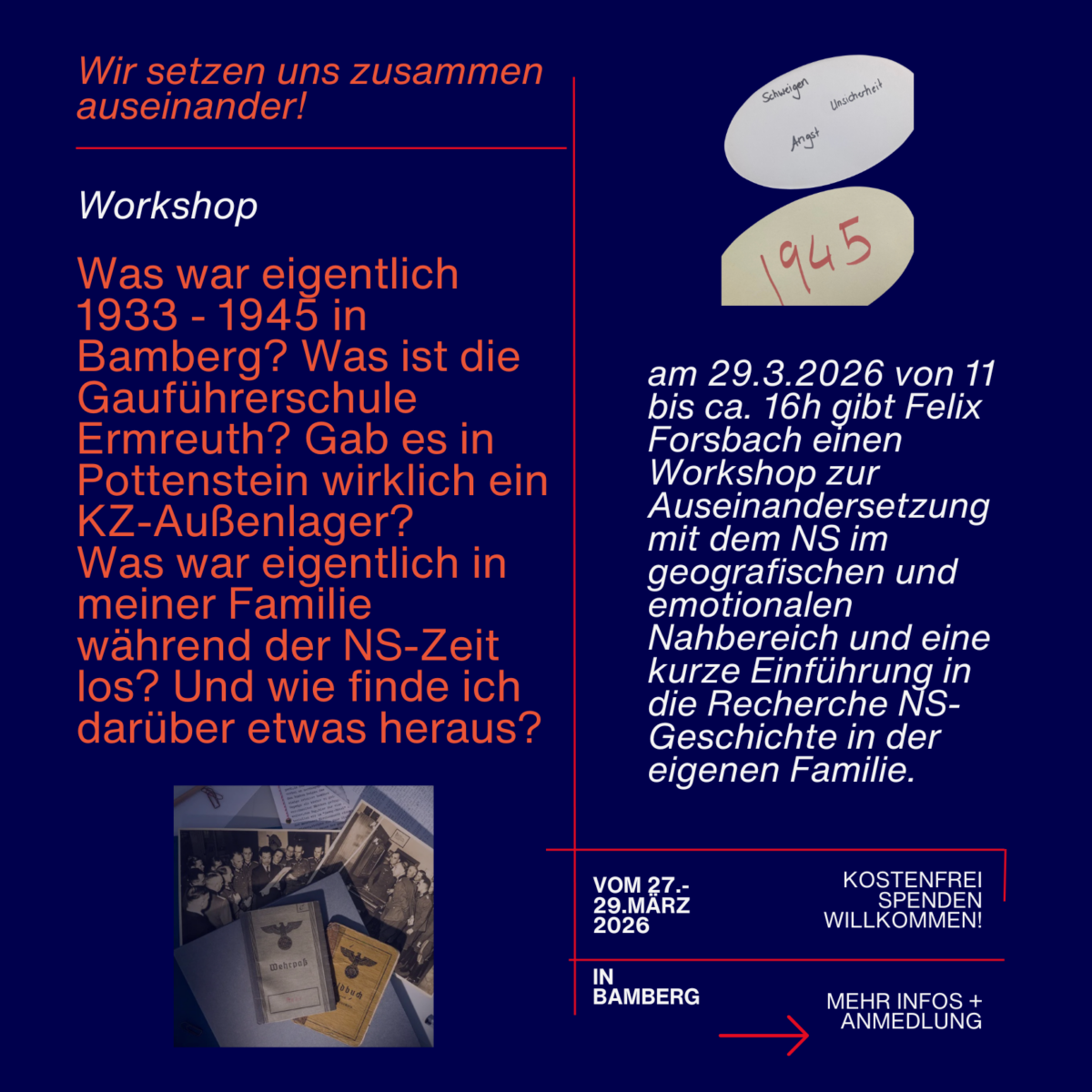 Workshop zur Auseinandersetzung mit dem Nationalsozialismus im emotionalen und geografischen Nahbereich. (Themen: Nationalsozialismus in und um Bamberg, Recherche zum Nationalsozialismus in der eigenen Familie.)