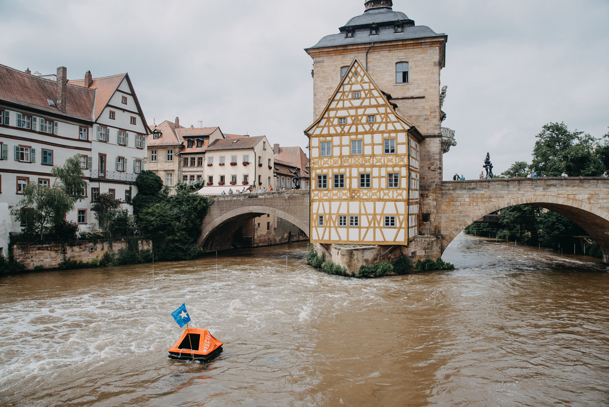 Ach ja und noch etwas: Wo gibt es denn den Weißwein? Eine Käsestange bitte – dann da lang. Lang muss keiner Warten um etwas leckeres zu Trinken zu bekommen. Bezahlt werden muss ein Weißwein dennoch – und das wird auch so bleiben! Zurück zum „Kon“: Konspirativ war der dreitägige Aufenthalt Christian Schnurers im Kesselhaus bzw. im roten Campingbus davor. Es lässt sich gut mit ihm bei einem Cappuccino mit Kakaopulver vor einem langsam luftverlierenden Rettungsfloß über Kunst sprechen. In der Strömung der Regnitz schwimmt die spannende Wiederaufnahme der Arbeitsserie rescue-europe und zeigt aktuell wie politisch und ambitioniert Kunst ist. In leichtem Tropfenregen sprechen wir über gegenwärtige Kulturpolitik und dann wird klar, dass es einen gemeinsamen Horizont gibt, an dem die Sonne am 13.6. zwischen den Wolken rot schimmert. So wird es Licht, rötlich, beim Betrachten und Sprechen über Kunst. Sprich mit uns über Kunst von gestern bis 30.6. im Kesselhaus. Um Zwischendurch unter Peter Kees‘ Schild mal Nichtszutun – wenngleich es schwer wird nichts zu tun mit so vielen. Wir sind bewegt und schleppen jetzt gleich die Anlage aus dem Kesselhauskeller hoch für Prinzip des Zufalls und Aerobiconoise. Bis gleich!